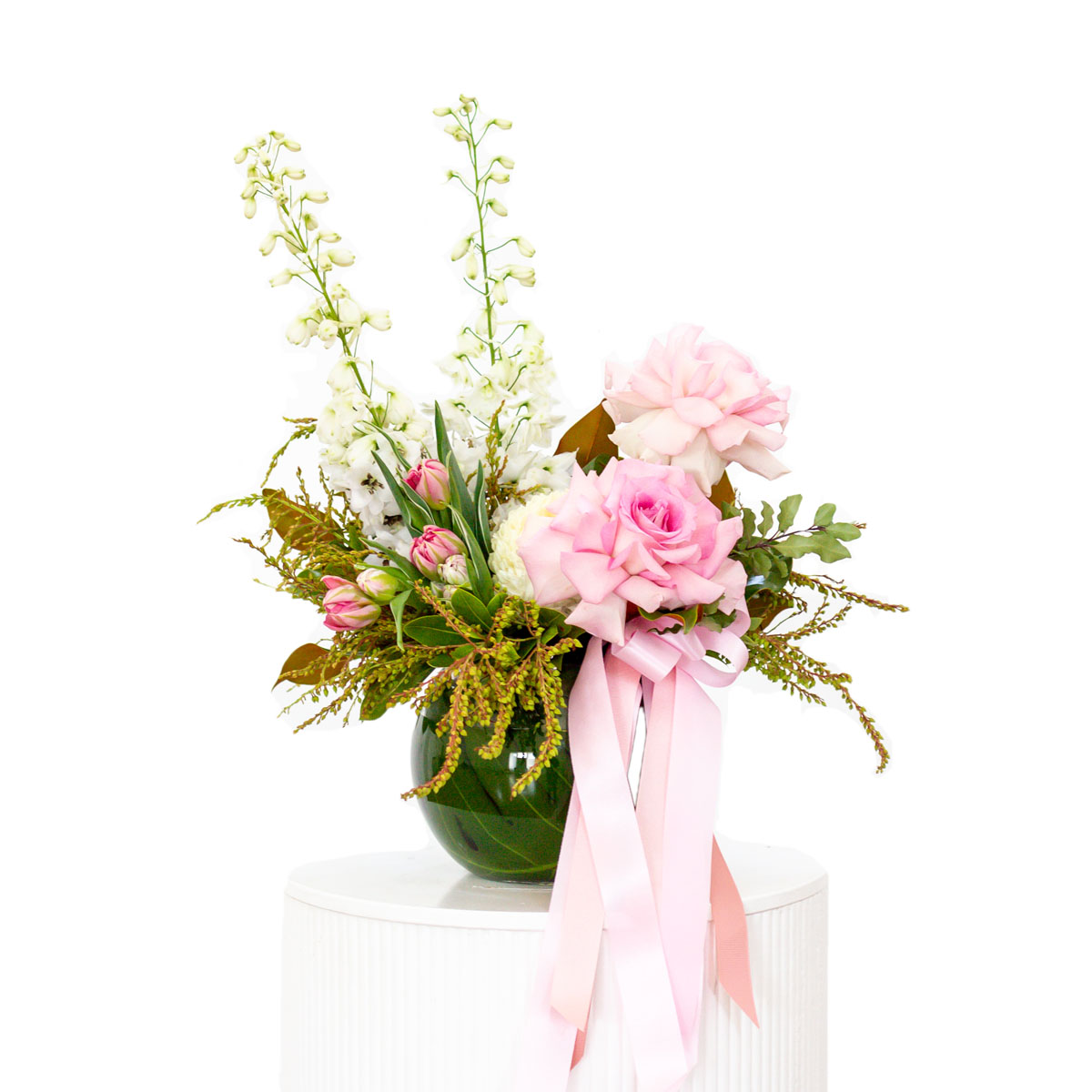 A feminine design of seasonal pastel tones presented in a premium glass ball vase.